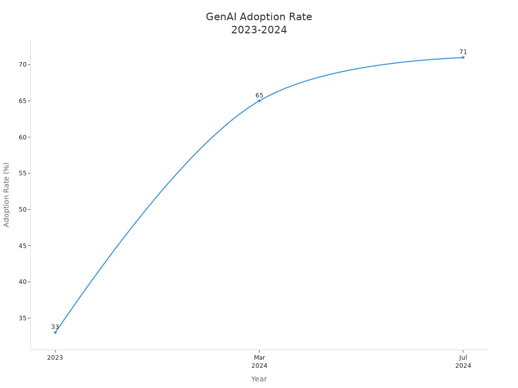 You see generative AI changing data engineering every day. With Microsoft Fabric, you can make data prep automatic. You can also work with text, images, audio, or PDFs in one place. Teams now do not spend much time on boring tasks. They spend more time finding useful information. The chart below shows how fast people are using generative AI: